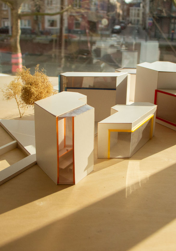 While investigating the site in Gentbrugge, it turned out that three quarters of the residents are musically involved as a profession or as a hobby. With that in mind, I made a communal garden offering spaces for rehearsal, concerts, recording studio, a bicycle shed, ... The main goal is together, to create an even more green communal site.